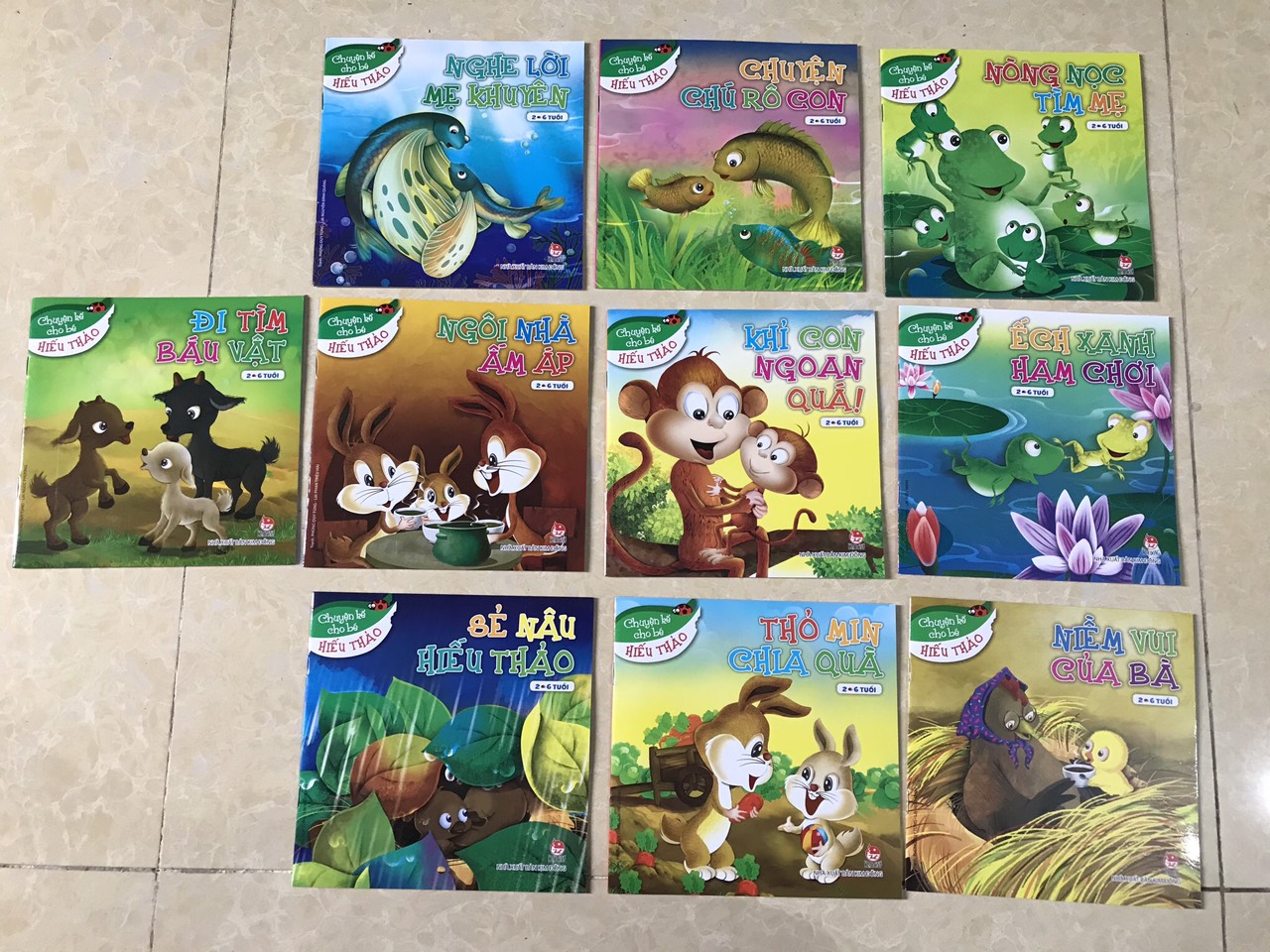 2. Giai đoạn 1-3 tuổi: trẻ đã có thể nghe nhìn, hóng, thị lực tốt hơn, bước đầu hình thành tính cách, khả năng tập trung tốt hơn thì những câu chuyện nhỏ, kéo dài 2-4 trang dần phù hợp hơn. KĨ NĂNG GIAO TIẾP DÀNH CHO BÉ 2-6 TUỔI và CHUYỆN KỂ CHO BÉ HIẾU THẢO là 2 bộ sách mình muốn giới thiệu: mỗi cuốn đề cập tới một kĩ năng – đức tính tốt gồm 3-4 câu chuyện nhỏ, mỗi câu chuyện chỉ dài 2-4 trang vừa phải, nhẹ nhàng như tia nắng sớm mai soi rọi những tâm hồn non trẻ. Một điểm cộng ở 2 bộ sách này là mỗi câu chuyện sẽ xoay quanh 1 bạn là nhân vật chính: anh Gấu an ủi, bạn Chuột nói dối, bạn Lợn biết nói lời chúc, … mà bố mẹ sẽ dễ dàng gợi nhớ câu chuyện với bé trong những buổi nói chuyện hàng ngày.