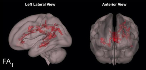 Các khu vực màu đỏ cho thấy sự tăng trưởng về chất trắng có tổ chức chứng tỏ đứa bé này có khả năng ngôn ngữ và khả năng đọc viết tốt, hỗ trợ rất nhiều cho việc học ở trường sau này.